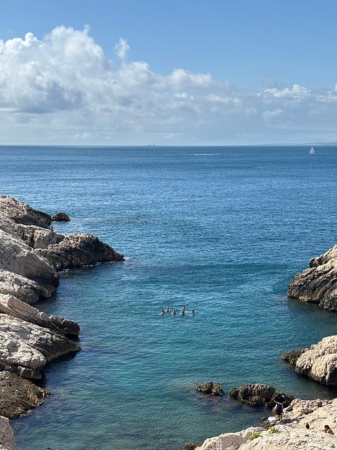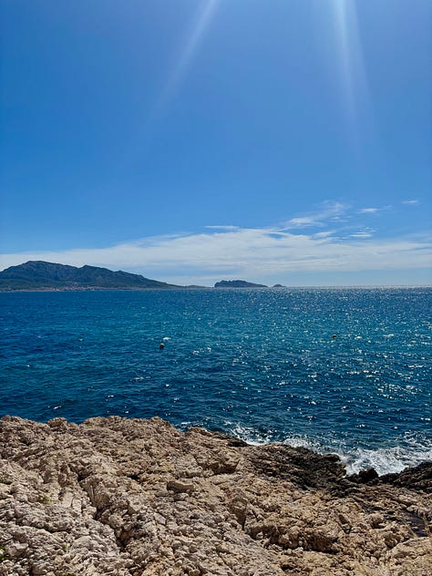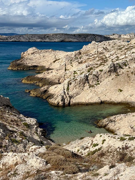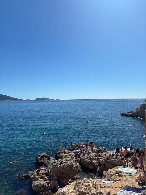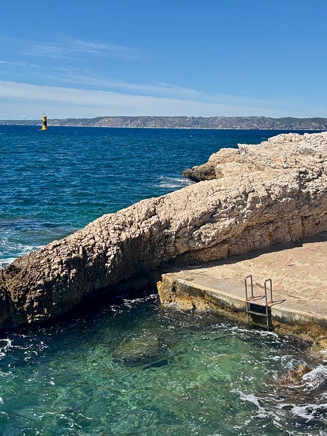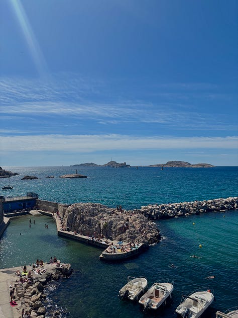Views from Notre-Dame de la Garde. On swimming in Malmousque: walk between Plage de Maldormé and Anse de Malmousque until you find a good spot. This may involve a certain amount of backtracking and walking on paths you aren’t sure are open. Just enjoy it. There is also an outdoor, seawater swimming pool called Piscine maritime des Auffes that looks nice. You may stumble upon Bistrot Plage, a restaurant/swim club with photogenic sun beds. We spent an afternoon there and it’s not worth it (the wooden deck was really gross and it was difficult to access the water) unless you’re fiending for a spritz on a sun bed, in which case who is anyone to judge.